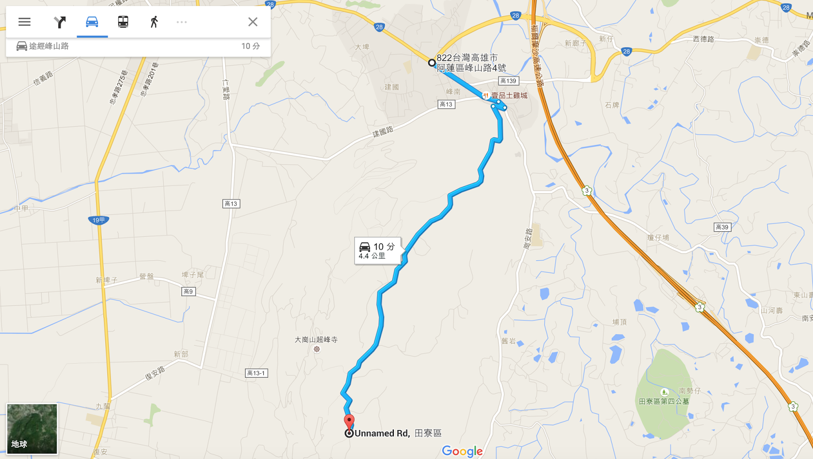 路線大概是這樣,請別相信 GOOGLE 地圖上的地標,那是假的,害我還在那邊繞了一大圈咧...路程大概十分鐘左右,不會很久,另外我們可以看到好像一堆人去過的大崗山超峰寺就在旁邊而已,實際上問過店家才知道,土雞城的確就在超峰寺旁邊沒錯,但兩者間並沒有車道相通,要前往的話就得用類似賭神滾下山的方式才能到達,敬請三思而後行。