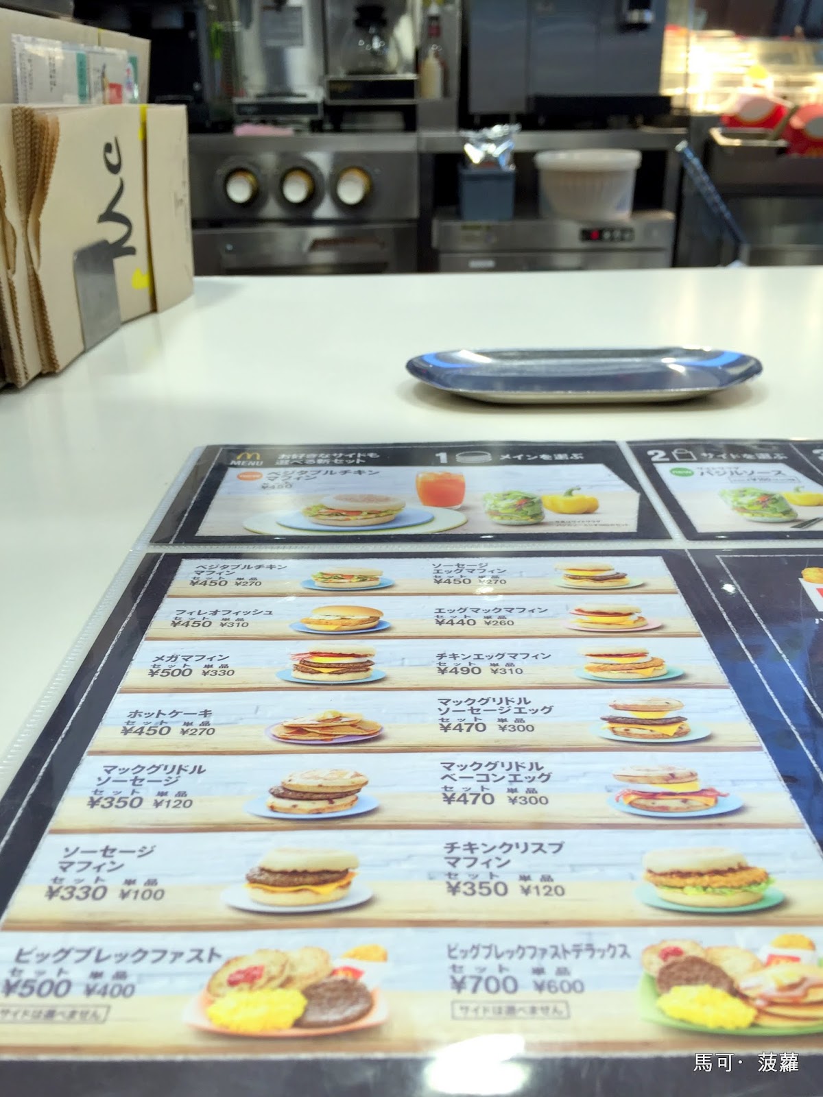 首先映入眼簾的是早餐餐牌上那兩排令人驚異的價格,一個漢堡 100 円是什麼意思?臺幣 26 塊 7 能夠在臺灣的何處買到一個漢堡?而且同樣的豬肉滿福堡在臺灣單點可是要價 40 塊錢的捏!日本的足足便宜了 33% 耶!可也只有單點比較便宜而已,要是點套餐的話就會比臺灣還貴了,臺灣相同內容的超值早餐只要 49 塊,而在日本點豬肉滿福堡的套餐則要新臺幣約 88.3 塊錢(330 円),套餐飲料裡面是裝神水嗎?另外點餐時看到了個亮點,最終我們還是決定來試試這亮點究竟是何方神聖。