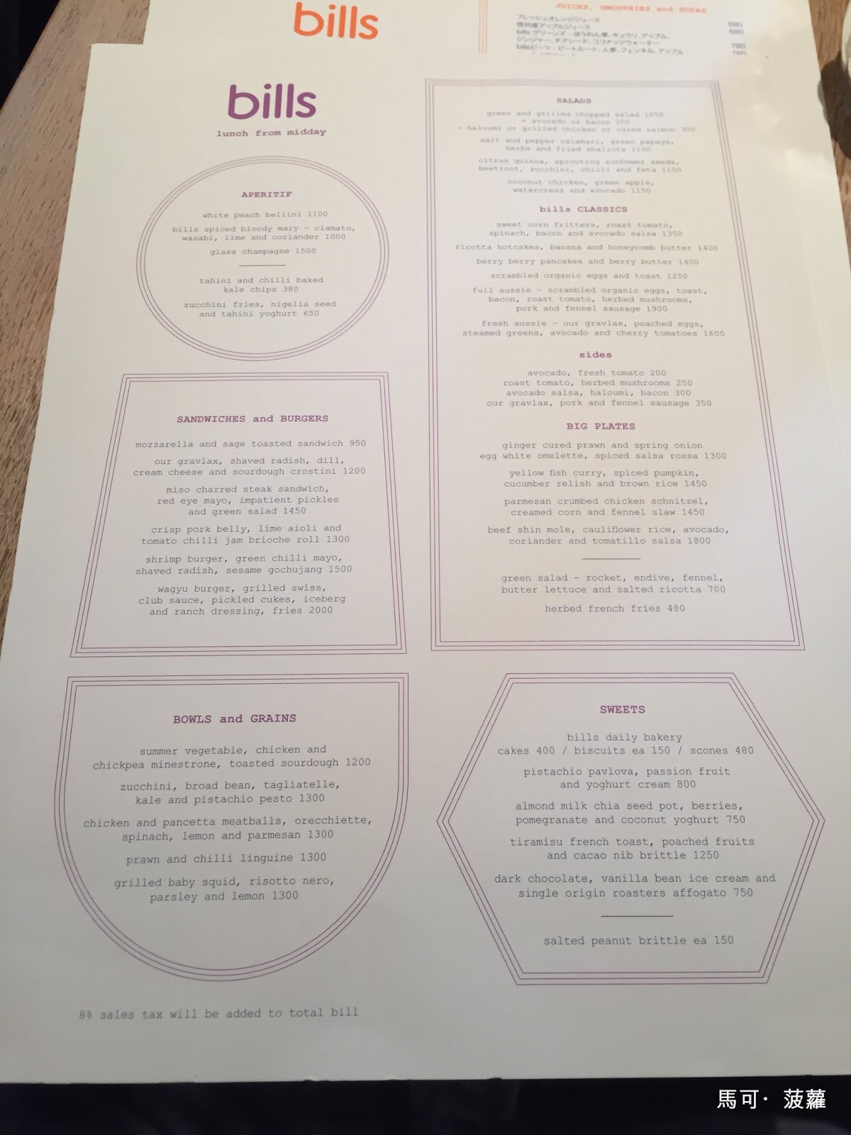 這世界真的是病得不輕,這樣一杯檸檬氣泡水((bills Homemade Lemonade)竟然也要價 680 円...縱使老婆喝了一口馬上給我配黃金傳說吃到好東西時的音樂,心裡的某個部位還是有點像歪了一邊的天秤...開玩笑,在臺灣喝這樣一杯檸檬汽水要花 180 的話,我馬上翻臉走人的啊!!!