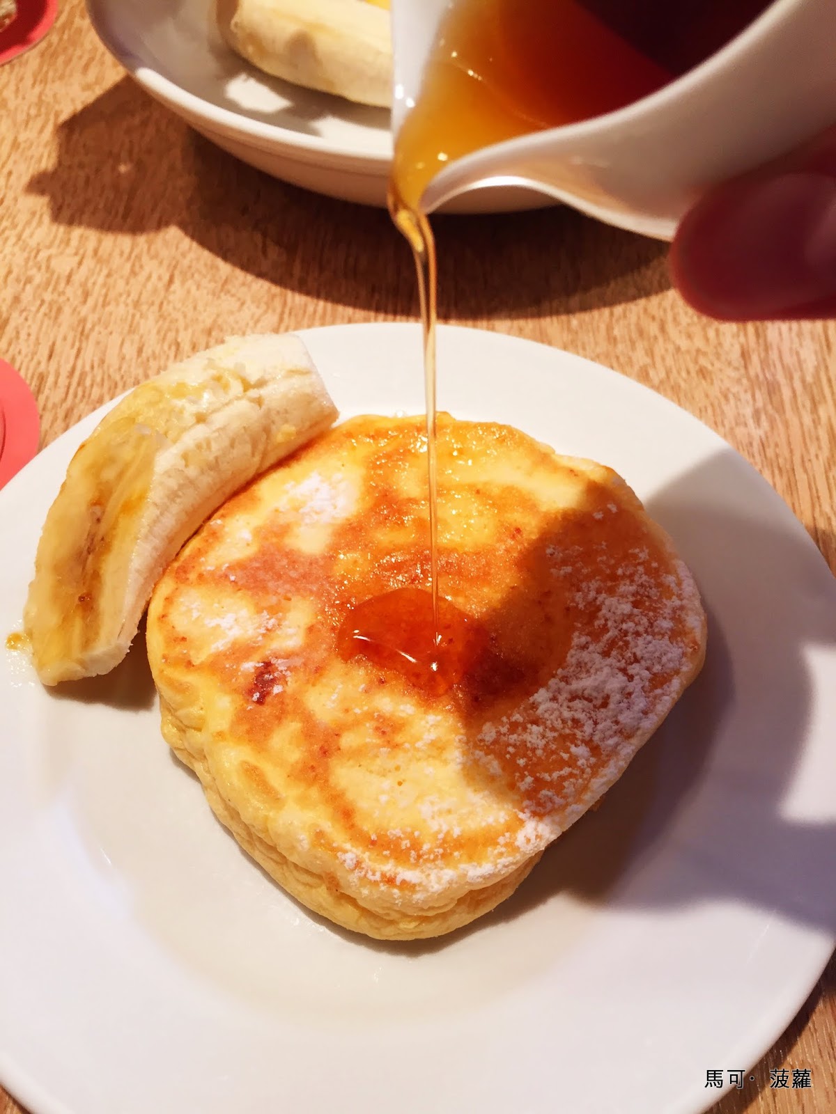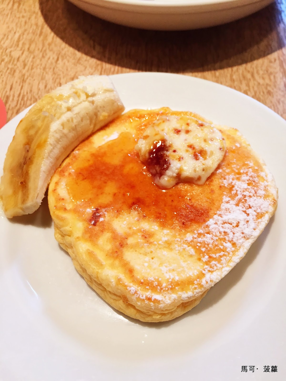在吃了一口之後,我立馬將刀叉給放下,再次仔細端詳了一下這盤鬆餅,然後掏出褲子裡的手機,接著用 Wifi 將相機裡頭的照片同步到手機上頭,開啟 Facebook,按下「打卡」按鈕,用當時想得到最誇張最讚嘆的字句將照片給發送到動態頁面上,原諒我這輩子沒見過什麼世面,鬆餅吃得太少,但如果有人宣稱這家鬆餅只是普通而已的話,我想我會很激動、很激動地問他:「要不然你是去吃過哪家更好吃的?!誰?!誰啦!?說啊!」這樣的疑問,這鬆餅吃起來,口感又熱又鬆又綿又滑就算了,那富含最美好的麵粉、雞蛋料理後的香味更是讓人無法抗拒,原先預期吃鬆餅時會有的厚重感,完完全全沒有出現,向各位報告,完全沒有!蜂蜜奶油、糖漿、香蕉搭配在這鬆餅上頭根本就是惡魔的化身,這鬆餅怎麼可以好吃成這副德性?如果世界上少了這道鬆餅,會不會因此而傾斜、或者水往上流?