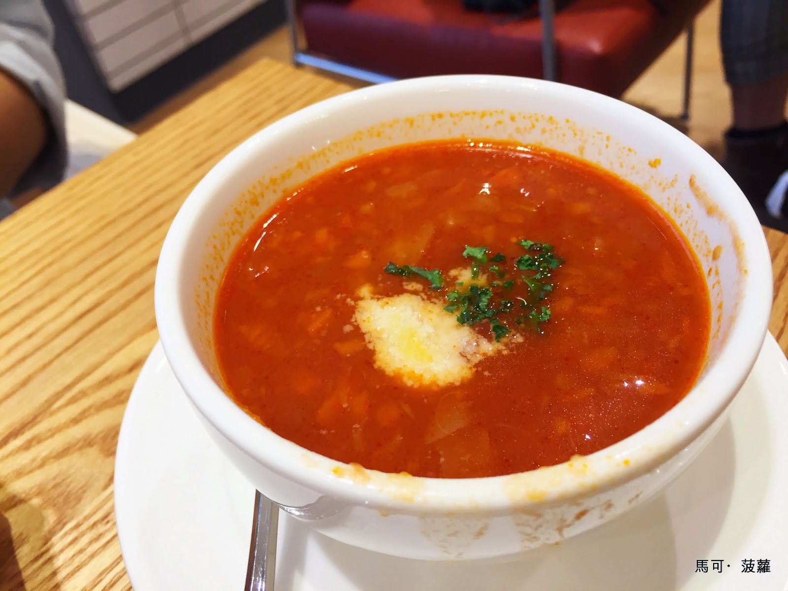 湯也沒得選擇,反正當天就只煮一種,再跟顧客說這就叫做「當日特製湯品」,既省成本又省事, 就算廚房盛湯的工作人員讓湯流得碗內外都是也在所不惜,美美的灑點巴西利跟起司粉才是重點,對吧?(可是這義式蔬菜濃湯起來的味道也不差耶,怎麼辦?)