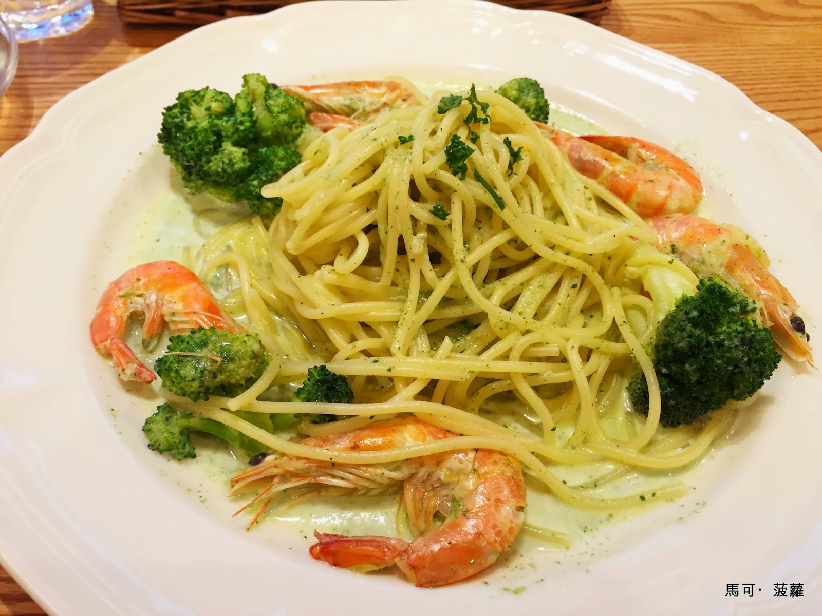 稍微點了份要價 290 元的「鮮蝦菠菜青醬義大利麵」,餐點上桌時,不由得開始思考了一下,這五位蝦子,是因為生長在某某蝦蝦養殖池當中的貴族世家嗎?要不然,同樣是由五位成員組成,怎麼會有另一批淪落到七賢路香味去讓歐巴喪給煮成了海產粥咧?好吧,香味海產粥一碗畢竟也要 150、160 的,尚屬高價位,那麼走富奸風格的四人組,不對,四蝦組模式的團隊,也是有被送到佑佑去讓歐巴喪煮成鍋燒意麵的呀....在我面前這五位蝦子,前世應該是燒了不少好香,最後才被送到 AFTERNOON TEA 來,搭配青醬跟花椰菜被煮成了義大利麵,可惜祖墳位置有差,蝦蝦們最後沒有獲得善終,吃起來有點像是中秋節烤肉時不小心烤太久的那種。(麵條尚稱彈牙,但份量以這價位來說,會讓人很想念文璋陽春麵,當然是要老老闆還叼著煙煮麵那時期的文璋陽春麵。)
