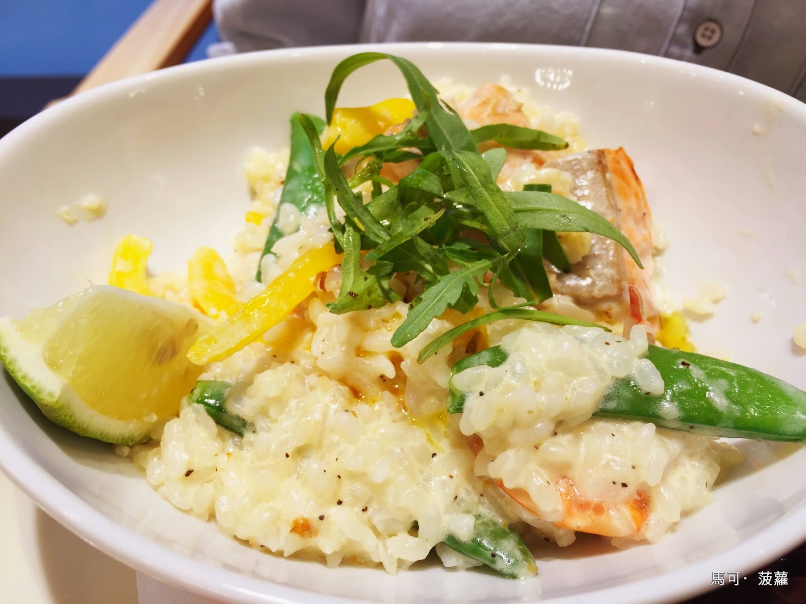 另外胎胎點的是「鹽漬檸檬鮭魚鮮蝦燉飯」,旁邊還附了一小份馬鈴薯沙拉,可能為的是要呈現它尊爵不凡要價 350 大洋的驚人氣勢吧,加套餐還要再多 100 到 220 咧,誰說高雄經濟不好?為了親眼看到自己把鈔票給吞進肚子裡還要讓人等上一小時呢!