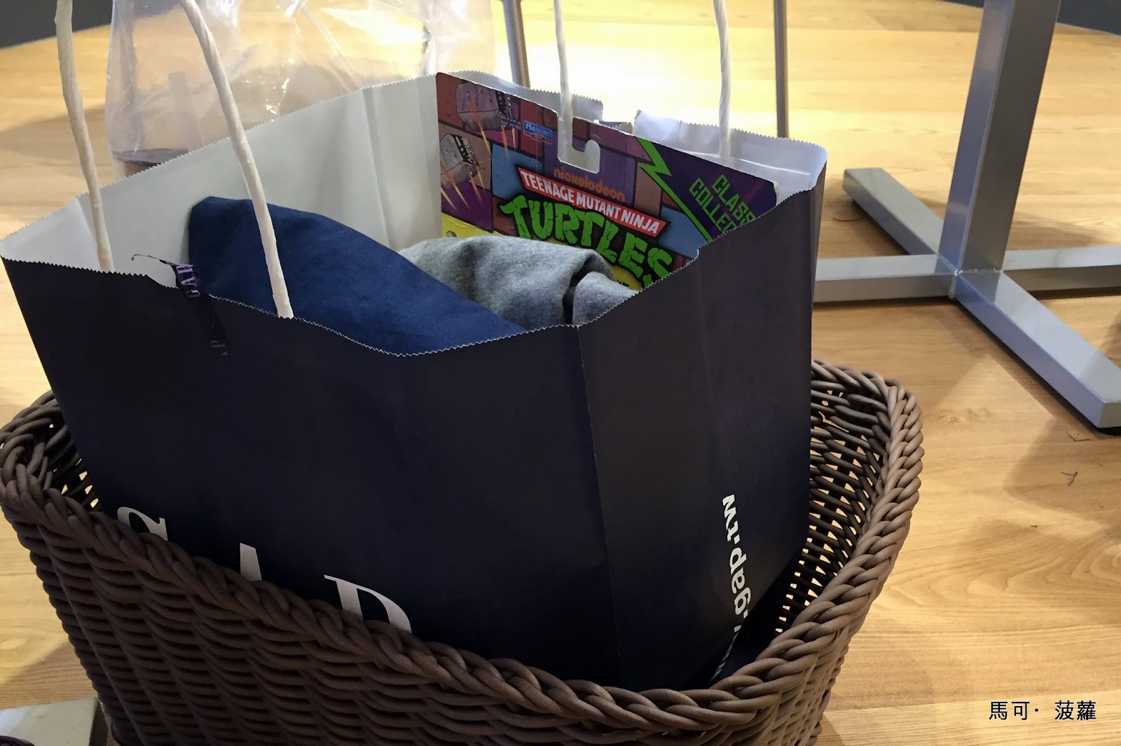 最近也越來越多店家注意到一些小細節了,能夠讓帶著包包或者購物袋的人不至於將這些細軟放在地板上導致髒污、或者被踢到,多半都會準備些置物籃給顧客存放,然後袋子裡裝的是因為腦波弱在玩具反斗城買的復刻版忍者龜,稍微被唸了一下...(真的,我是走硬派路線的男子漢啦!)