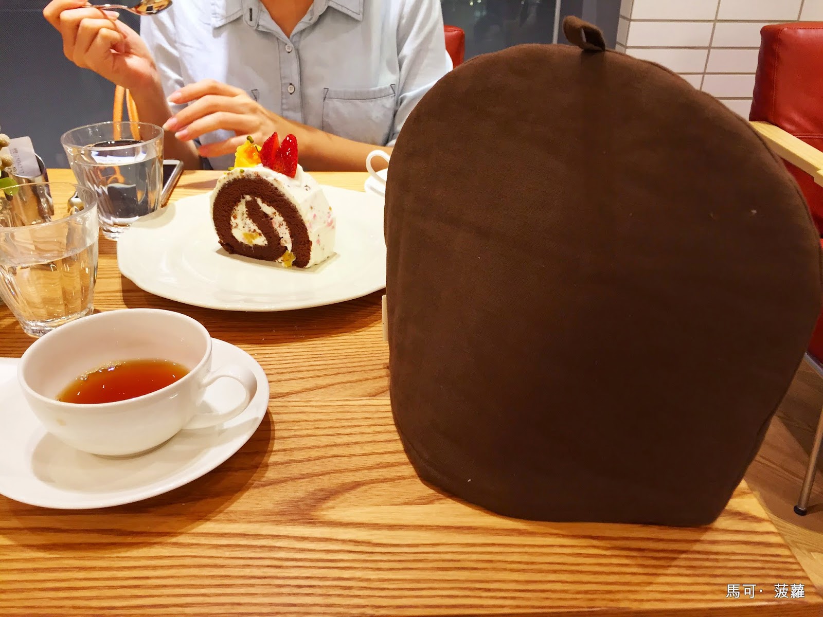 終於耐著性子把剛剛的麵啊飯的通通給解決了,總該要辦正事了吧?想起來我們當天點的是加了 220 元即可享用120元飲品、150元甜點 & 當日特製湯品、麵包的套餐,再單點一份主餐,開玩笑...光是這樣的組合就要一張小朋友了,給我兩百塊,我都可以去黃昏市場生出一桌比這些更豪華的好不好?照片後頭的是甜點,面前的桌上放了一頂帽子,不是要讓客人戴的,裏頭包著的是茶壺,用來保溫的,當天稍微點了個「焦糖茶」,雖是無糖的喝起來卻有濃濃的焦糖香味,挺不賴的。