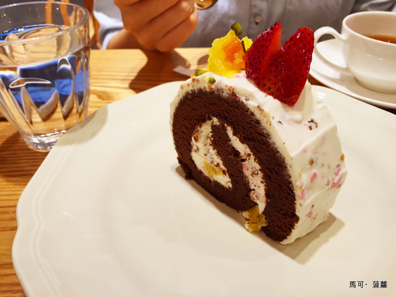 點餐時一瞬間忘記了與栗子甜薯蒙布朗蛋糕在櫥窗前的曖昧對望,腦波弱的看到巧克力就給它點了下去,它的學名為「柳橙草莓巧克力蛋糕捲」,沒辦法,身為一個走硬派路線的男子漢,看到巧克力也同樣是會心軟的啊!噢~上面還有草莓耶~(大心)外頭的白色奶油又香又不會太膩,巧克力蛋糕帶點微微的苦澀就像初夜戀一樣,頭文字雖然是柳丁,但是存在感稍嫌薄弱了點,有點像《西遊記》裏頭的觀世音一樣,隱隱約約的,很神秘;蛋糕裡頭有些長得很像堅果的東西,它們其實....真的就是堅果,好像說是開心果吧,讓這蛋糕的層次更顯得豐富,無論在口感跟口味上的確是有它的不俗之處,噢~早知道就多點一份甜點了討厭!(by 走硬派路線的男子漢。)
