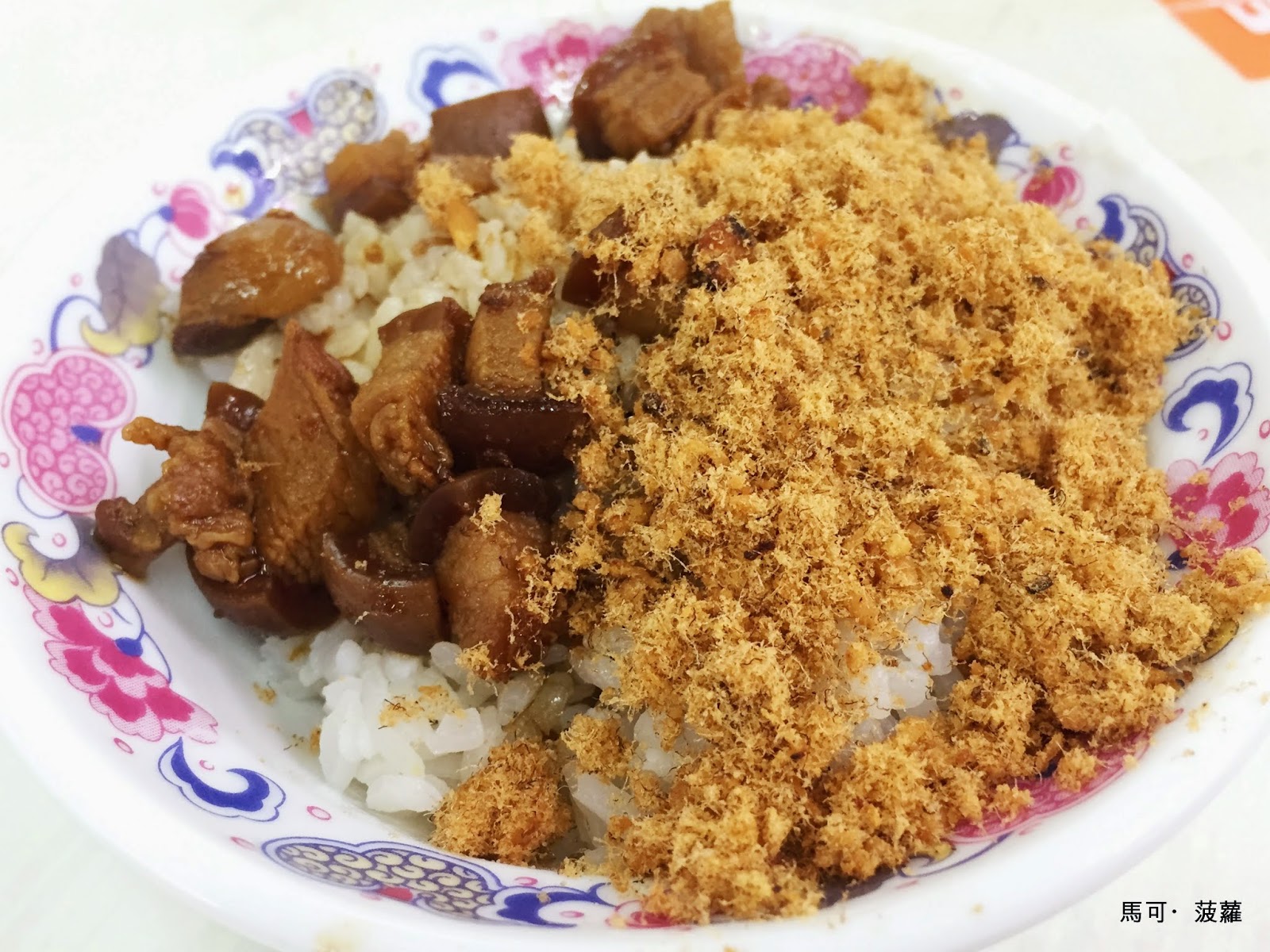 B 哥還沒有來,他的小弟陳浩南...不是,是魚酥肉飯就先上來了,名字聽起來很有海洋風味,其實應該說它是擁有《無敵鐵金剛》風味的一碗魚酥肉飯才對,請各位仔細觀察下這碗魚酥肉飯,在粒粒香 Q 的白飯上頭,左邊淋上的是店家秘製肉燥,而右邊則是灑上了甜美可人的魚酥,這樣兩極化卻又彼此融合的一碗飯,不正是走著那《無敵鐵金剛》裡頭阿修羅男爵的風格嗎? 哎呀這店家真的用心良苦啊~然後太太也非常好胃口的幹掉了阿修羅男爵,直說好吃,該不會她是阿強一號嗎?(阿修羅男爵:小碗 20 元,大碗 30 元。)