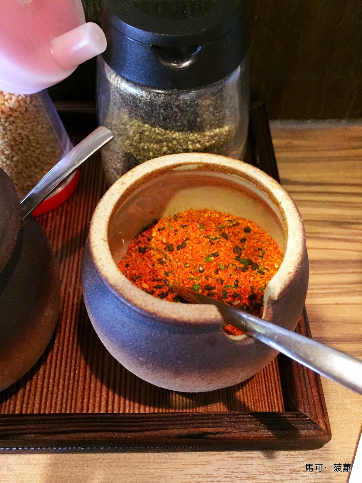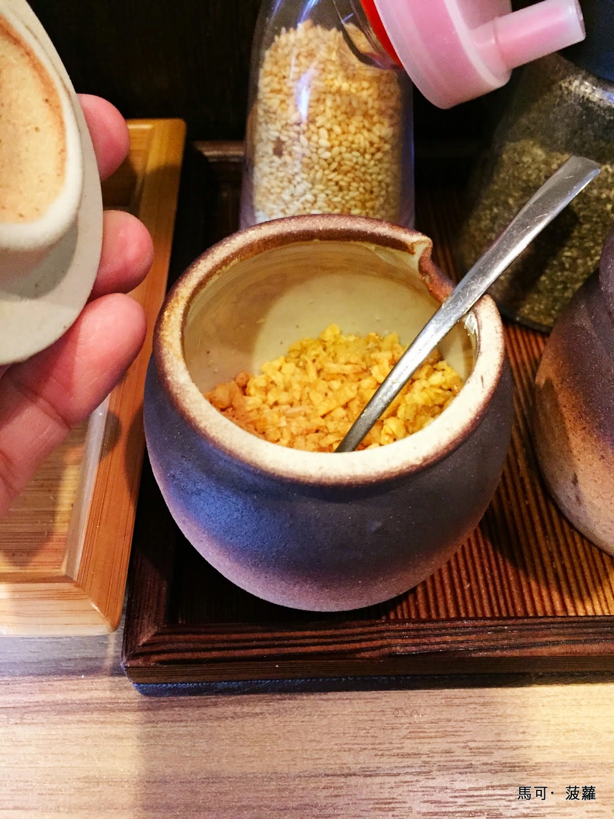 即便店家在點餐方式、餐點口味跟裝潢陳設都已經與我們印象中在日本常見的拉麵店有幾分相似了,不過旋即就讓小弟在店裡稍稍遇上了一下「有臺灣特色」的服務方式,因為對於座位前面所擺放的這些佐料有點興趣,便呼喚了旁邊方才一直惠我良多的那位「少爺」來詢問,問說這一小壺裡是什麼東西,結果他露出免舔靦腆的笑容,回答我說:「不太清楚耶,應該是某種豆類吧!」當下實在是有些半信半疑,一直到吃麵吃到一半時,添了一點在碗中才發現,啊這就是炸蒜頭酥啊,算逃餿~餿餿餿~我還聰明豆咧...如果是在日本的拉麵店當中,我相信店員應該都會很熟悉店內所擺放的調味料是什麼才是。