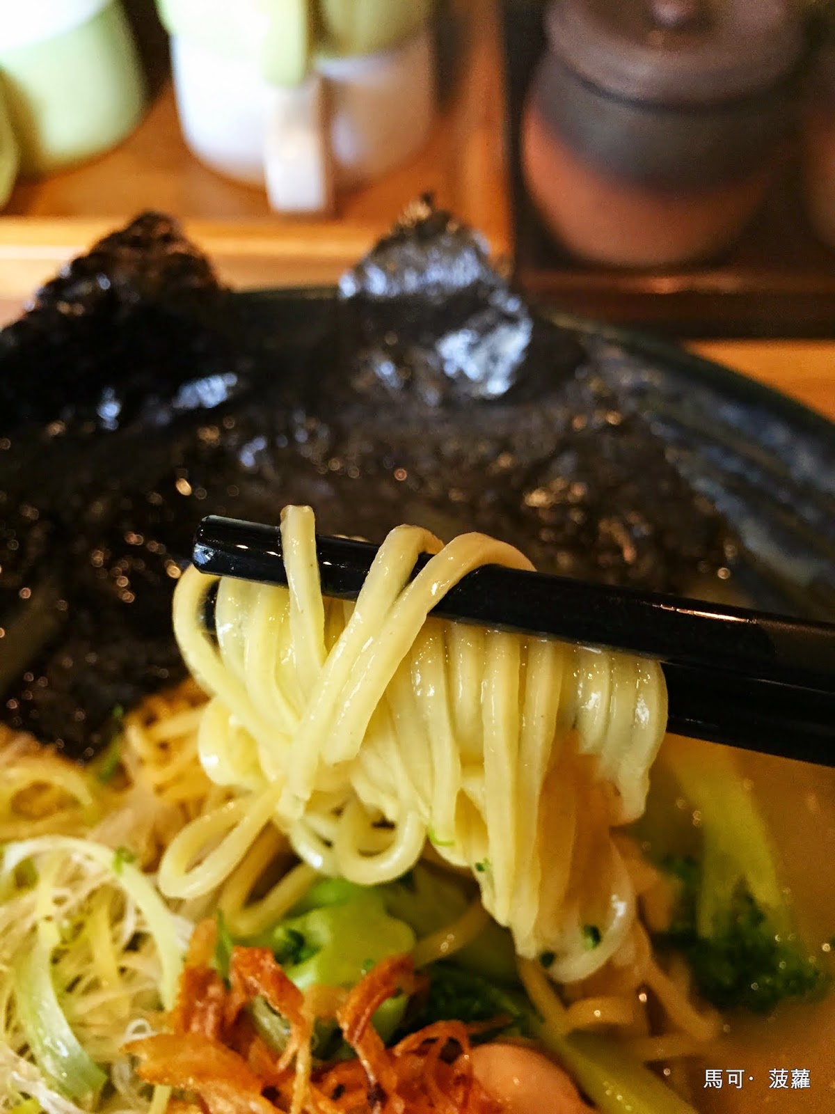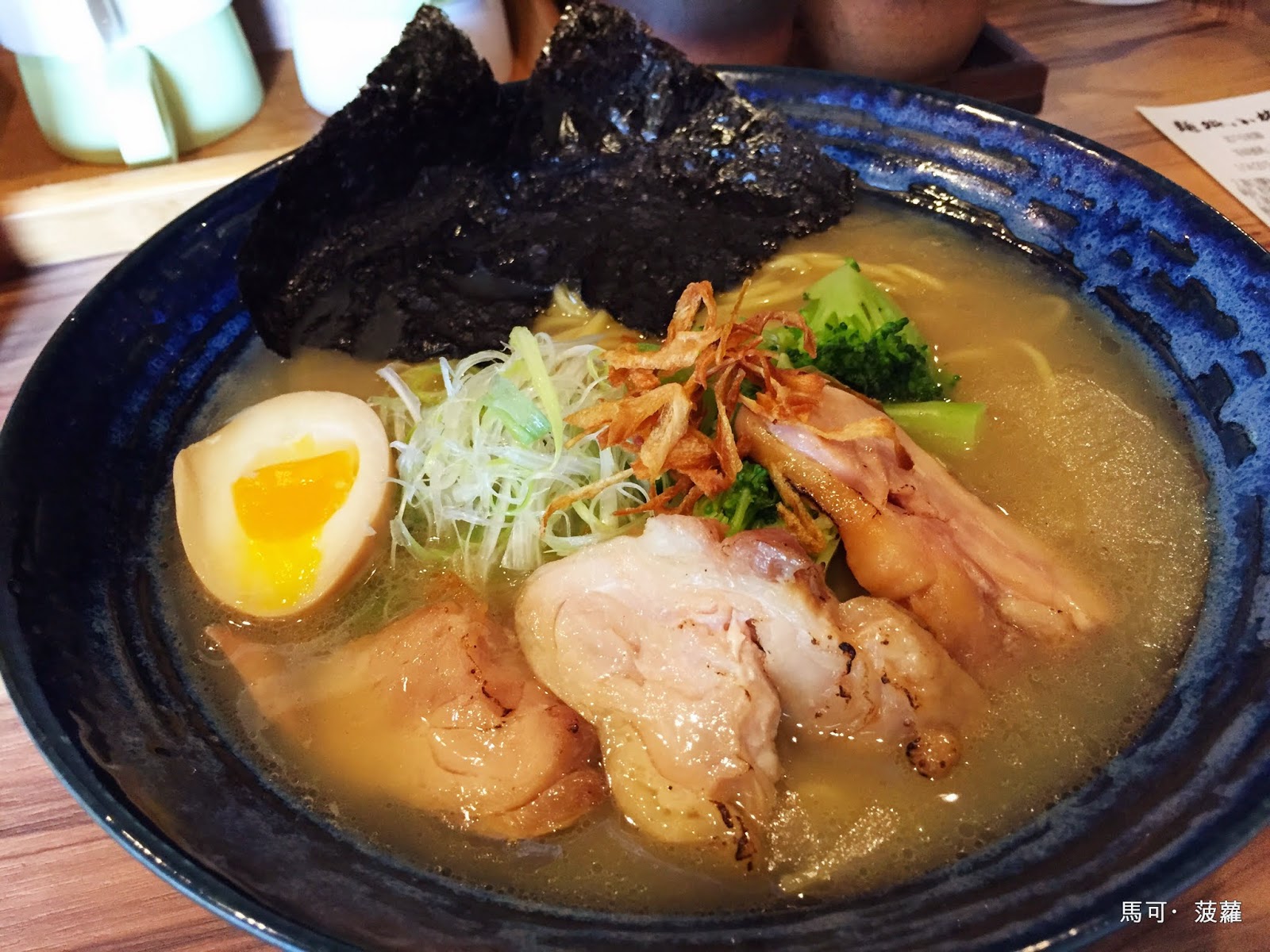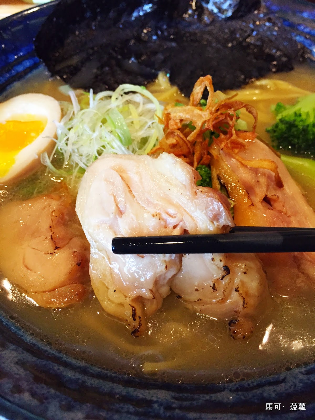 接著再一個小轉身,朱浩仁便投進了...不對,我們點的拉麵就來了,這一碗是為「雞白醬油(小)」,映入眼簾,首先吸引我們的便是花椰菜,哇咧花椰菜耶!居然可以在拉麵裡面吃到花椰菜, 太神奇了,然後那叉燒的模樣也不太一樣,當然啦,雞白就是要配個雞叉燒啦!只放上豬叉燒而已的話那就是半套啦~半套店的話就不好玩啦~雞白醬油湯頭喝入口中的第一印象,是一股似曾相識的味道,一同來吃的前女友也這麼說,:「它好臺喔!」,對,沒錯!就是那股熟悉的臺灣味,但是又巧妙地在最後餘韻方面多了一道往上跑的力道,簡單講就是有尾勁啦,所以也就不是說臺得很徹底了,只能說這雞白的味道處理得挺不錯,沒有像某些臺式拉麵店一般,在最後的餘韻上跑出了肉燥味,這點很重要,例如楠梓有間名店...(雞白醬油(小),190 元)