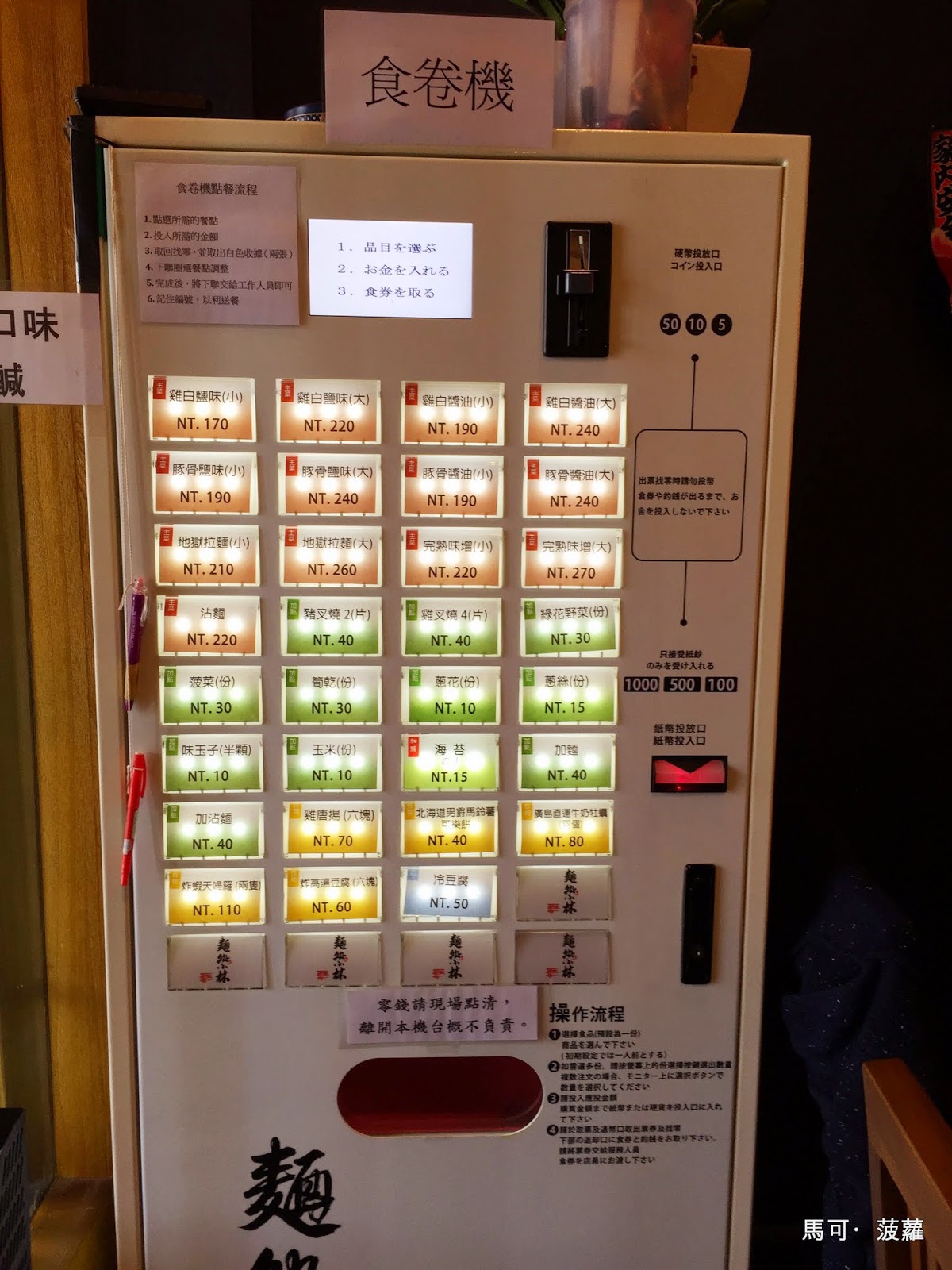 開玩笑,這個我最會了,每次去日本吃一蘭都馬是我在幫大家點餐的好不好,連在京都的錦市場買那間かりかり博士還博土的也都是我在處理的咧~(因為都是你要付錢啊傻蛋...)而麵處小林的「處理」方式也挺簡單的,就是先按自己要吃的口味,然後再依顯示金額繳費, 哼哼...厲害吧?(這不跟汽車停車繳費一樣而已嗎?)