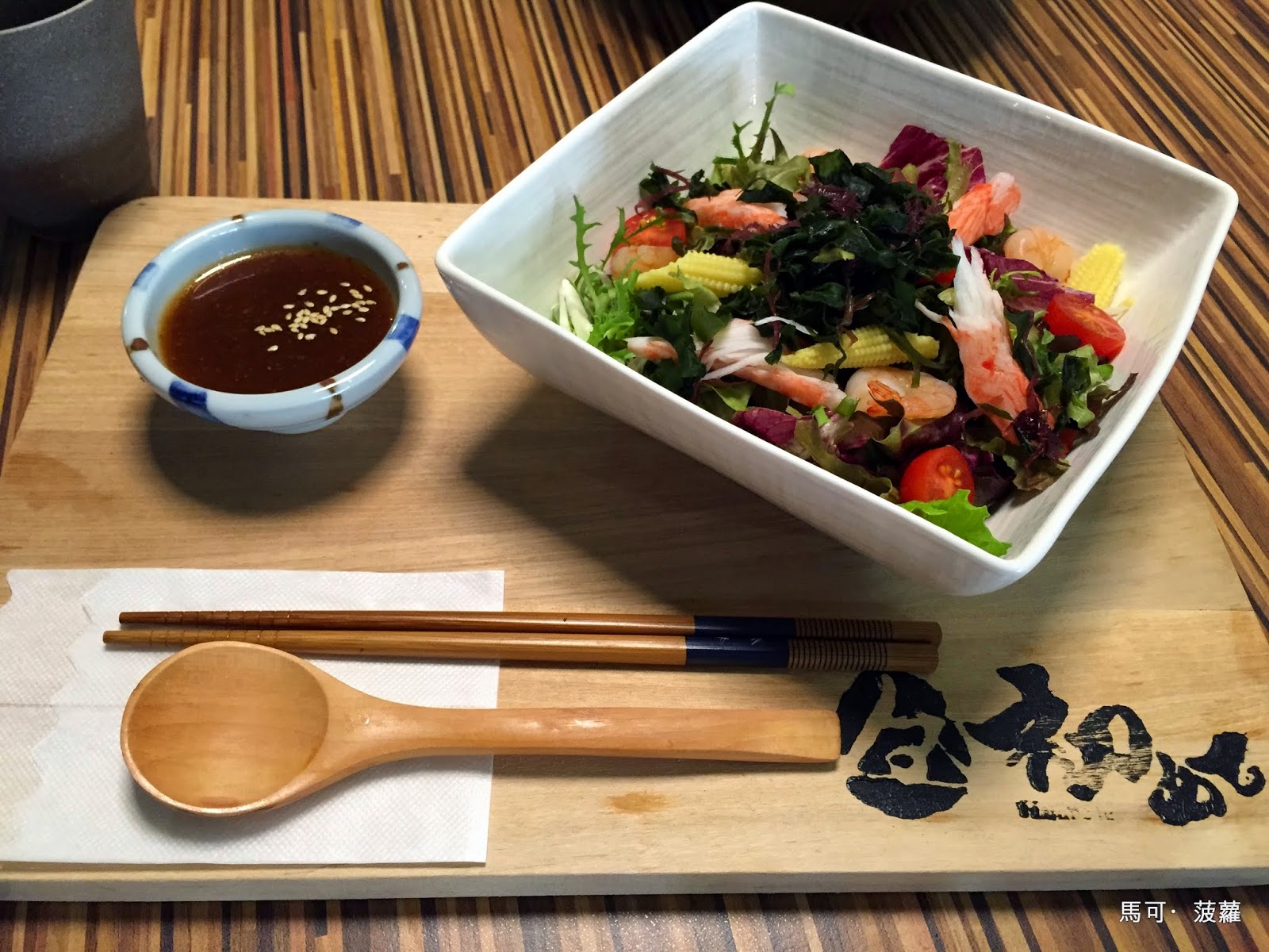 獨特的木製托盤上擺上一碗沙拉,搭配的則是和風醬汁,酸酸甜甜的相當開胃,裡面的內容也挺豐富, 光上面的玉米筍與蟹肉棒就好吸引人了,這時當然就要搶先拿起沙拉匙為大家服務啦~然後刻意的把自己不喜歡吃的有意無意的分給大家,剩下最後要裝自己的時,「咦?怎麼只剩下玉米筍跟蟹肉棒?」「哎呀~那沒辦法囉,只好免為其難的都我吃好了,唉...(夾)」,稍微分享這個小撇步供大家參考,希望你們會喜歡~