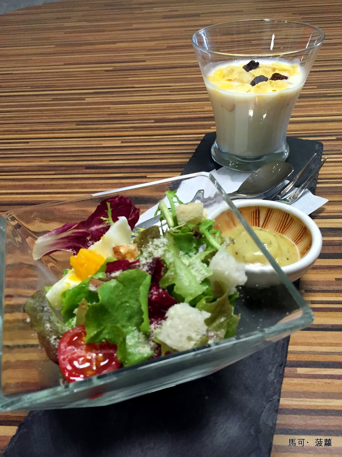 嗯?怎麼還有沙拉?這份則是點用套餐的單人小份量沙拉,搭配的醬汁則是凱薩醬,托盤上另外那一杯則是加了穀片的奶酪,還奉送一杯餐前喝的豆奶,這早餐未免也太豐盛了點。