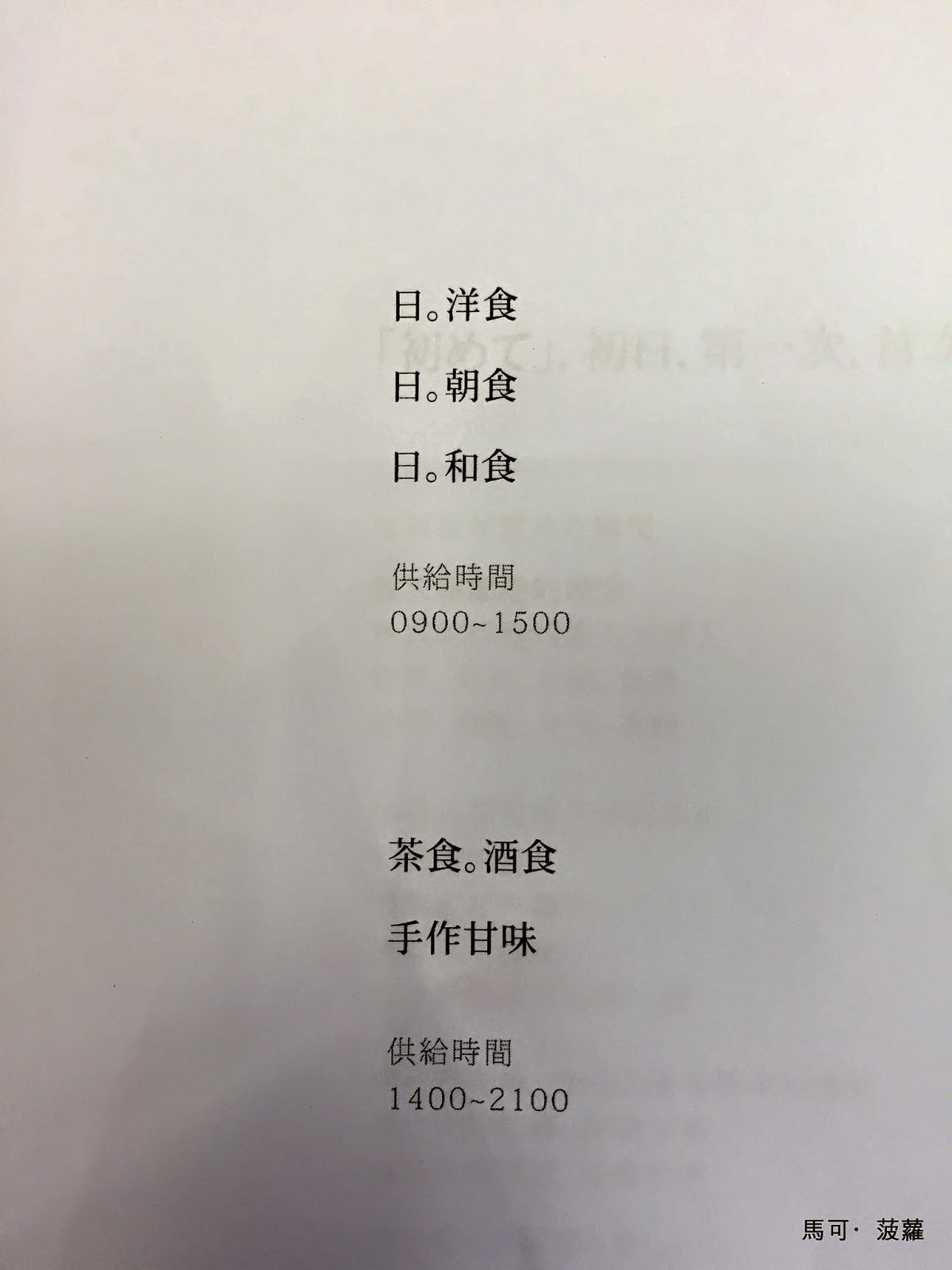 而餐點的部分則是由早上九點供應到下午三點,由兩點開始,則還另外有些小東西及日式甜點可以選擇,這個供餐方式則不免讓人覺得有些可惜,如果能夠在晚上時段也有供餐的話,那麼也許可以吸引到更多的上班族來吃晚飯,畢竟我們高雄人白天都幾乎是在上班居多,而要是等到下班後才來的話,也只有茶食、酒食跟甜點這些小東西可以享用了,可能店家有不得不這麼做的考量,這一點我們倒是無從置喙。