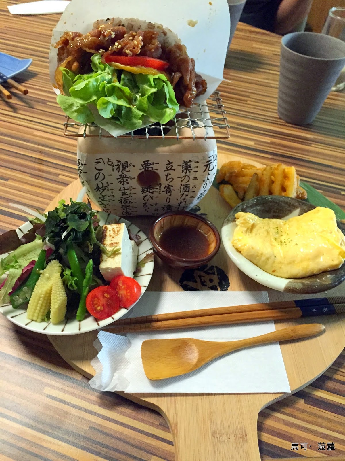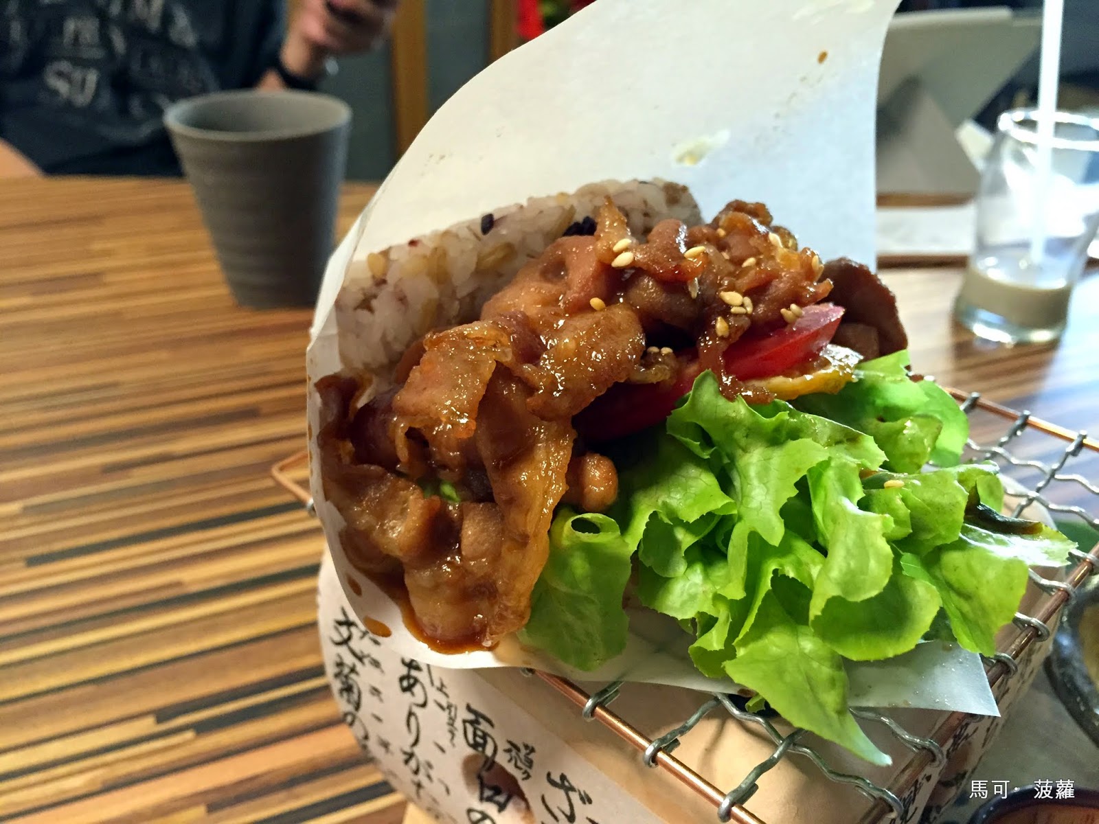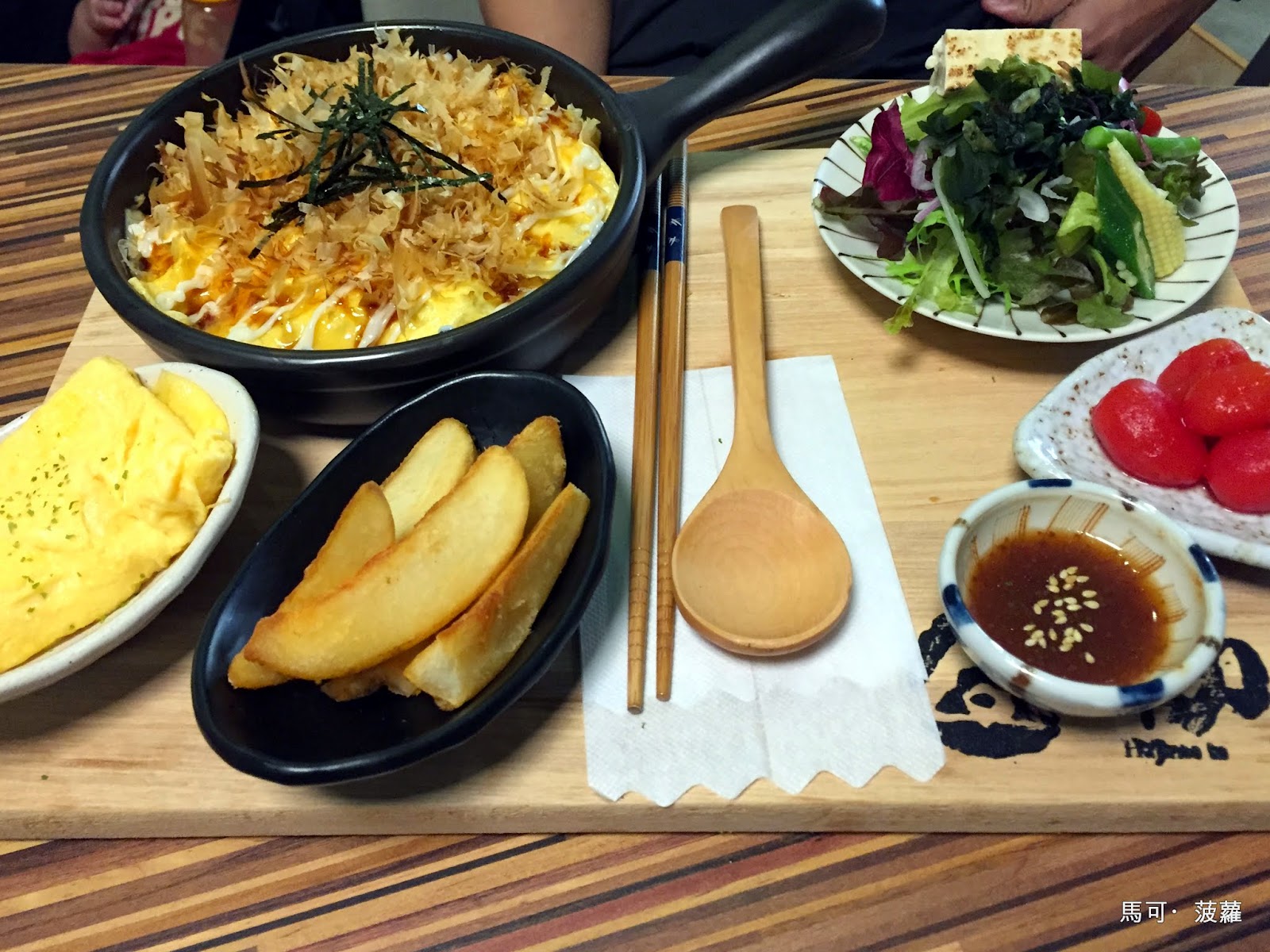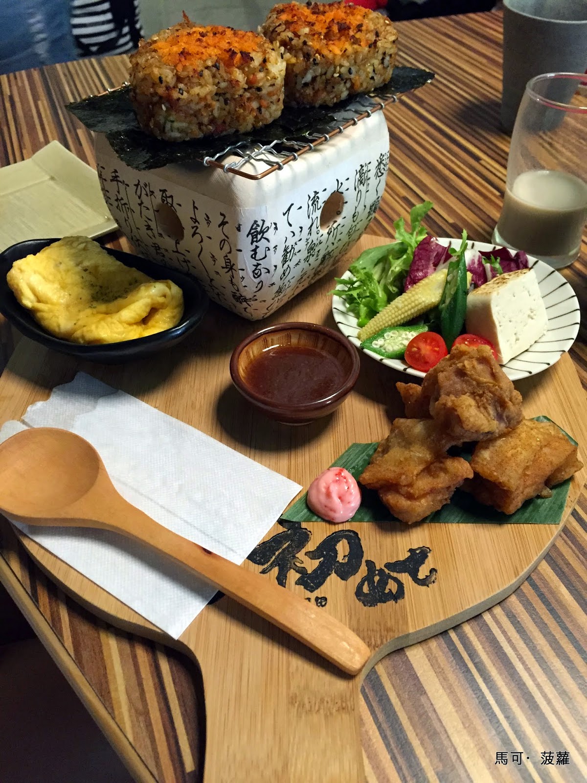 另外還有「烤鮭魚飯糰」,這是一個 Set 的套餐形式,所以不只有飯糰,另外還有沙拉、煎蛋、日式炸雞塊等配菜,同樣擺在店家自己獨有的托盤上,視覺上那個火爐也扮演了蠻吸睛的角色,怎麼這飯糰上桌時還要像三媽臭臭鍋一樣繼續的用火在下面烤嗎?