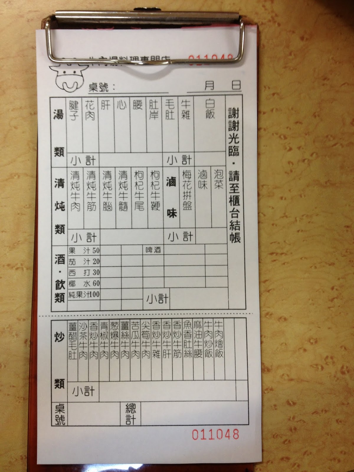 就這樣,看完菜牌,在這份嘔大上面勾選自己喜歡的牛鞭或者牛胇之類的,再交給一旁一臉無奈的阿姨,如此一來我們變完成了一個點菜的動作啦~
