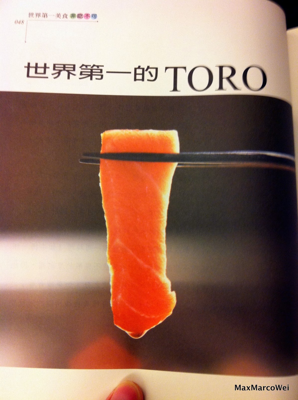 光看這第一章,其實我就對這本書有點改觀了,先由白肉魚之王真鯛講起,接著再來說紅肉魚之王Toro,而且也告訴了我們Toro為何叫做Toro的由來以及典故,然後接著講世界各地有些什麼鮪魚,以及鮪魚的哪些部位比較好吃、或者適合做成什麼樣的料理云云,重頭戲在後面,作者開始講述他在某些高級的店裡所吃到的Toro絕品料理,例如森本正紀、紐約壽司名店Masa(這也被他排名為紐約第一,有這麼厲害嗎?!)有一道「塔塔鮪魚肚」、名店「數寄屋橋次郎」、「末廣鮨」的Toro料理是多麼的厲害等等的,另外還教說要怎樣吃才能吃出Toro的好味道,即便連吃完之後有的店家還會附上「世界第一」的哈密瓜當甜點,或者建議吃完之後可以去「日本最佳的賞富士山景點」喝喝咖啡....我只能說醫師您享受的還真是面面俱到啊.....